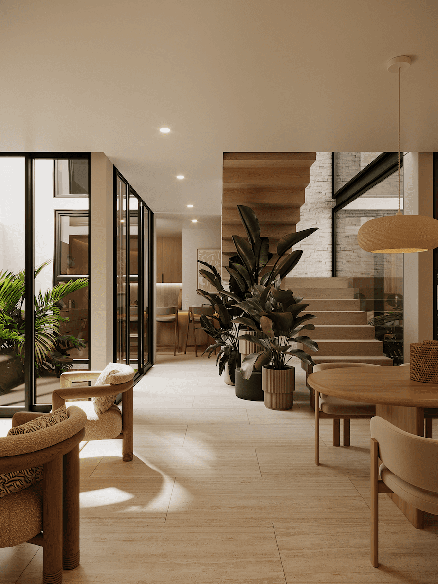 "Casa Raíz" se concibe como un santuario de serenidad y conexión con la naturaleza, donde la arquitectura se fusiona armoniosamente con el entorno.