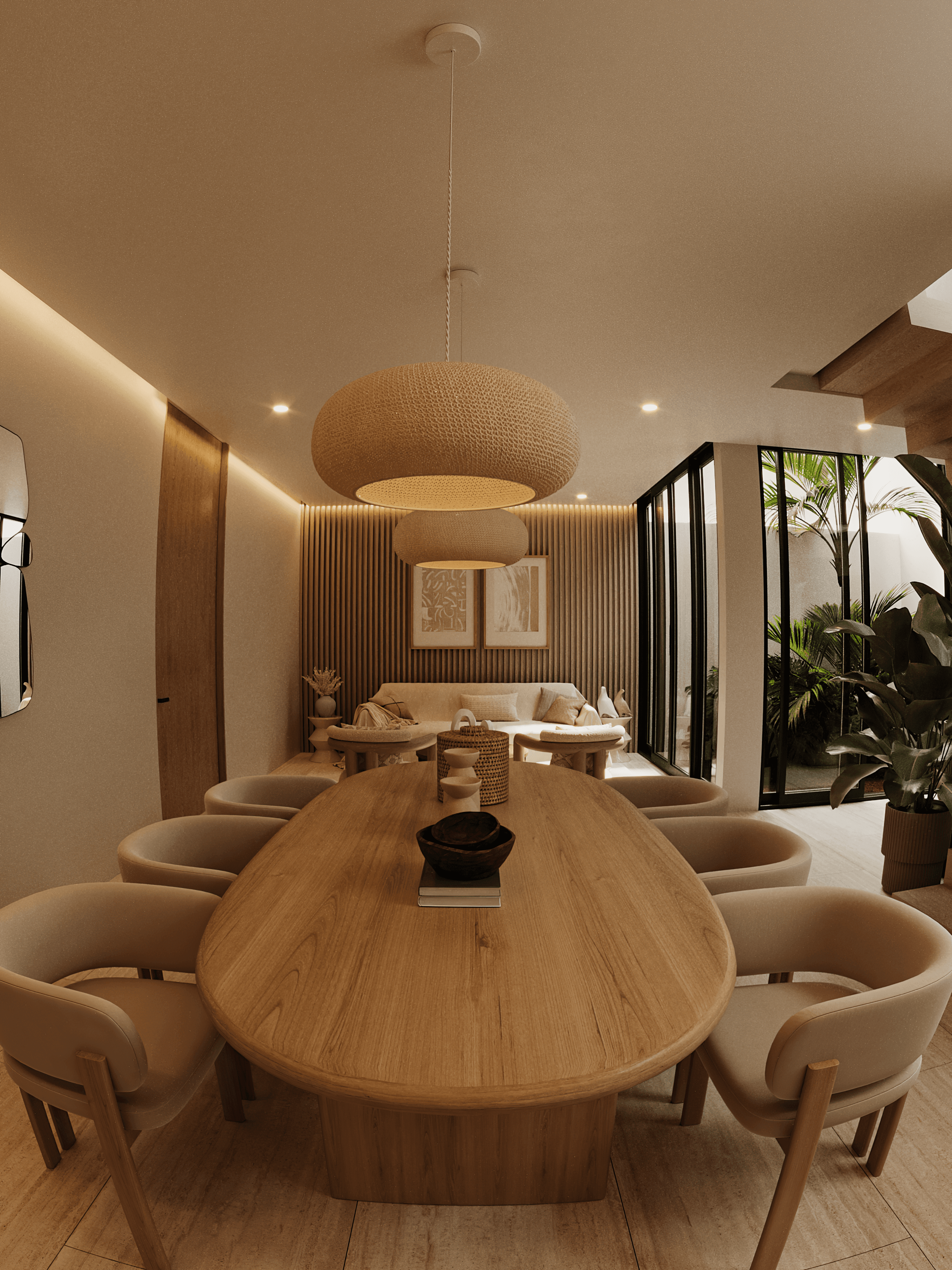 Mobiliario Curvo: Las formas orgánicas y curvas del mobiliario (mesa ovalada, respaldos de sillas, lámparas de fibras tejidas) contrastan con la arquitectura lineal, suavizando el ambiente y contribuyendo a la sensación de calma.