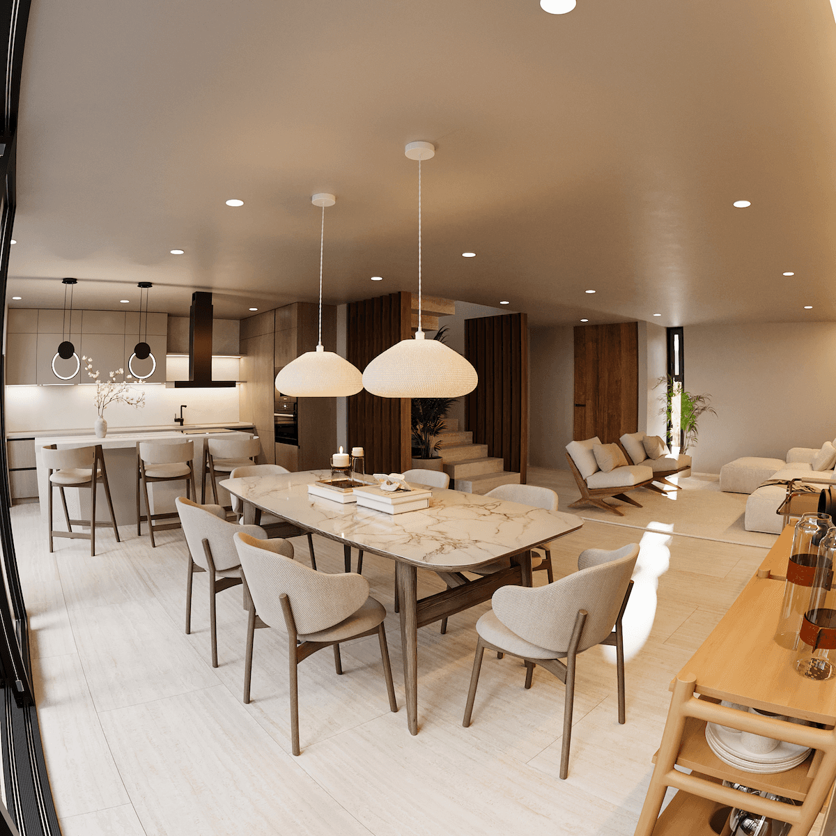 Iluminación Artificial: Se utiliza iluminación puntual empotrada en el plafón (spots), creando un cielo raso despejado que mantiene la estética minimalista. Lámparas de diseño sobre el comedor y la barra añaden los únicos elementos colgantes.