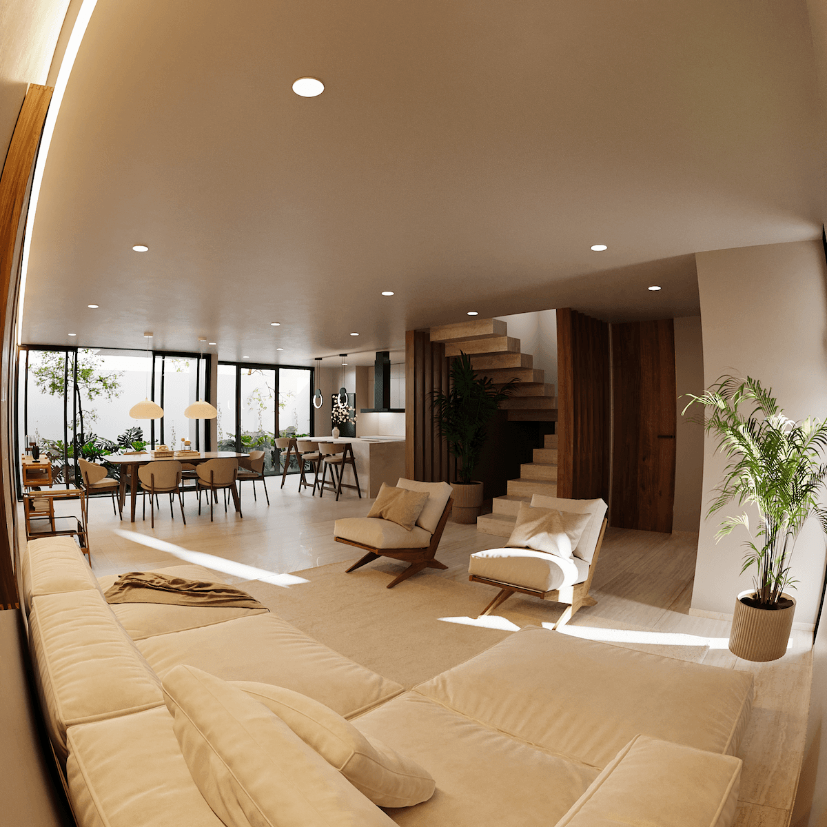 Grandes Ventanales: El área social se abre completamente a través de cancelería de piso a techo hacia un patio o jardín interior. Estos grandes ventanales (con marcos oscuros para generar contraste) eliminan la barrera visual con el exterior y garantizan una iluminación natural constante en el comedor y la sala.