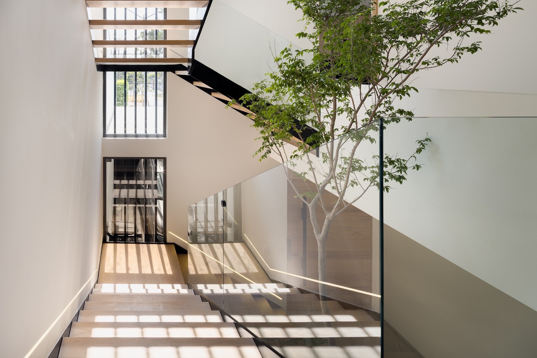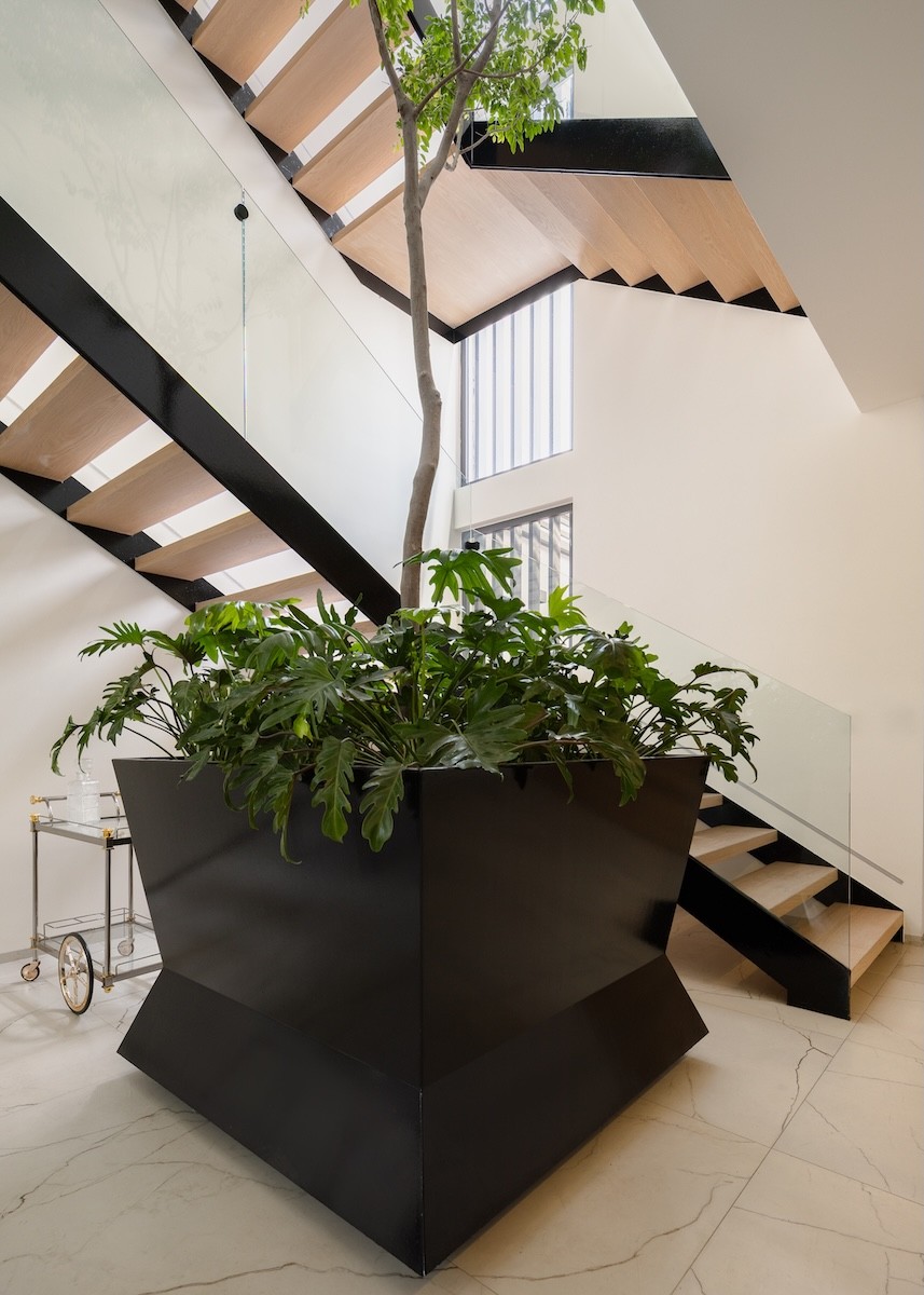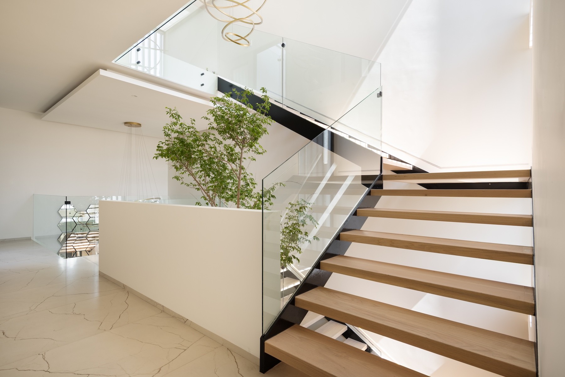 Elementos Escultóricos: La escalera, protagonista visual en las áreas sociales, es una obra de arte en sí misma. Sus peldaños de madera flotante, anclados a una estructura minimalista y enmarcados por barandales de cristal templado, aportan ligereza y transparencia. La luz cenital acentúa su forma, convirtiéndola en un eje vertical que conecta los niveles con elegancia .