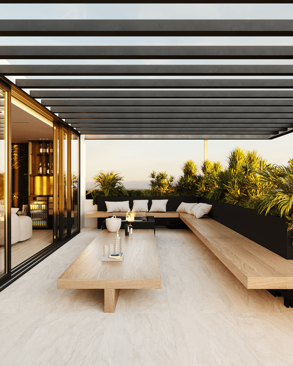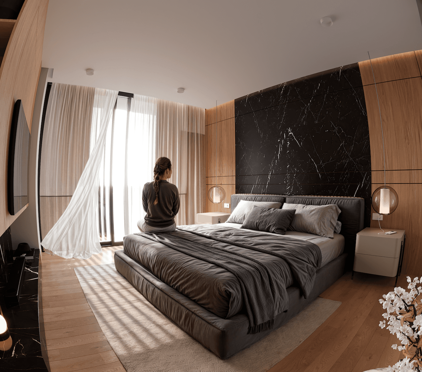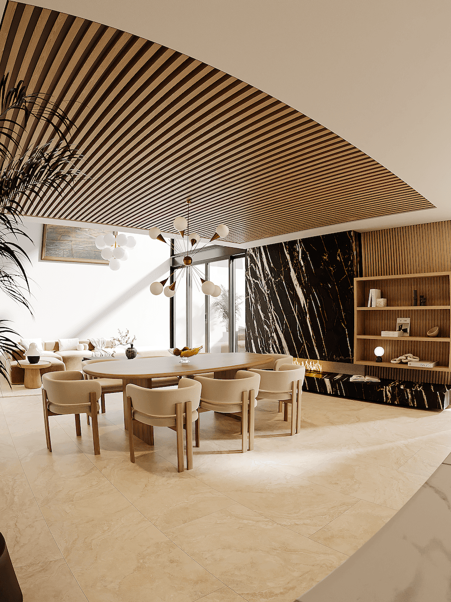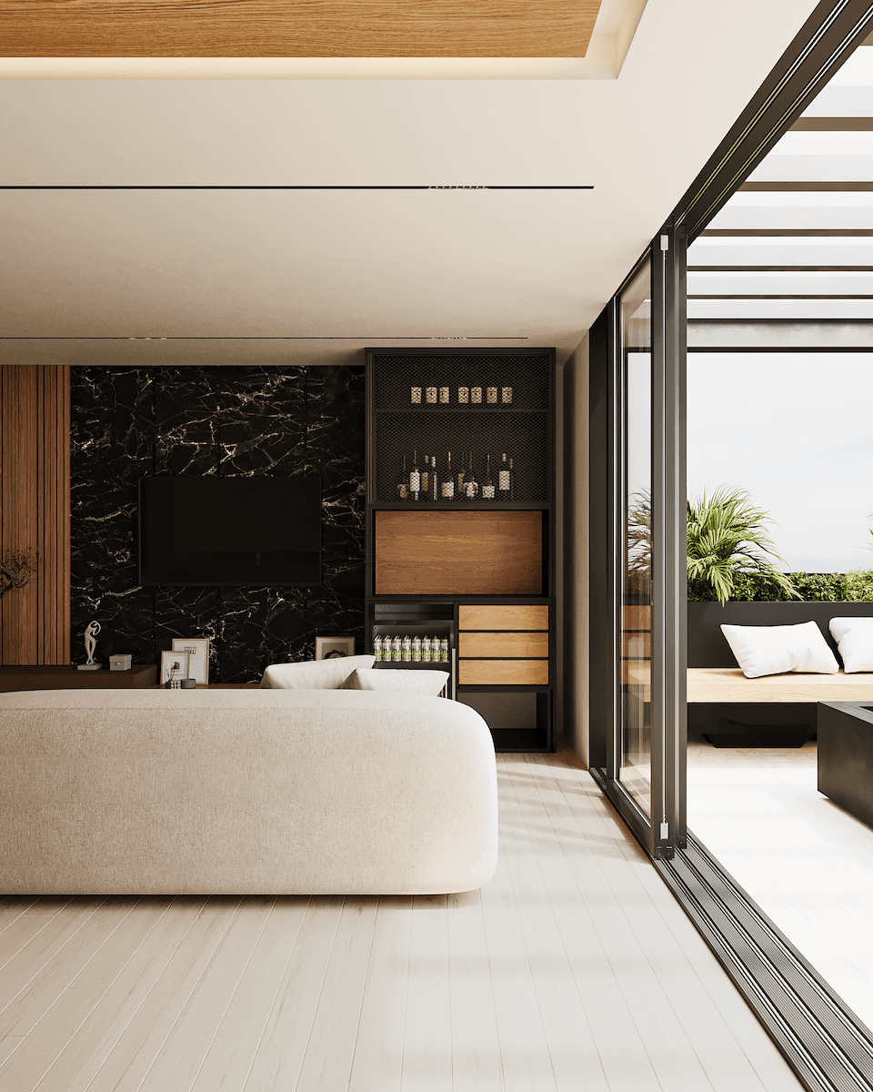 Su éxito reside en la elegante combinación de materiales, donde la calidez de la madera y la neutralidad de la piedra se encuentran con el contraste dramático del mármol negro, todo ello al servicio de un objetivo primordial: enmarcar las vistas y proveer una experiencia de vida luminosa, cómoda y moderna.